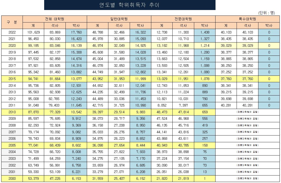 - 2022년 대학원 전체 학위취득자는 101,629명으로 박사 17,760명, 석사 83,869명으로 나타났습니다.