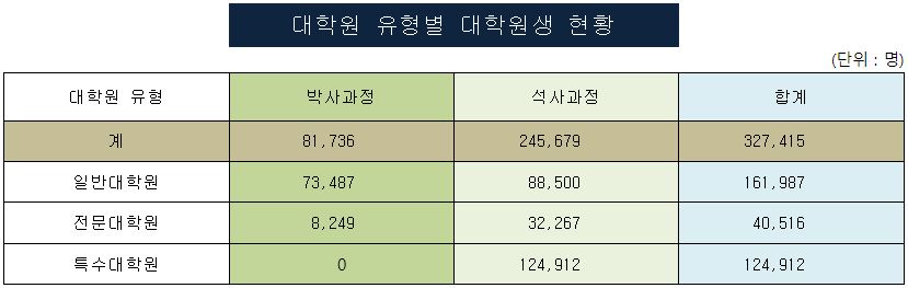 - 2021년 기준, 전체 대학원생은 327,415명으로, 박사과정 대학원생은 81,736명으로 석사과정 대학원생은 245,679명으로 나타났습니다.