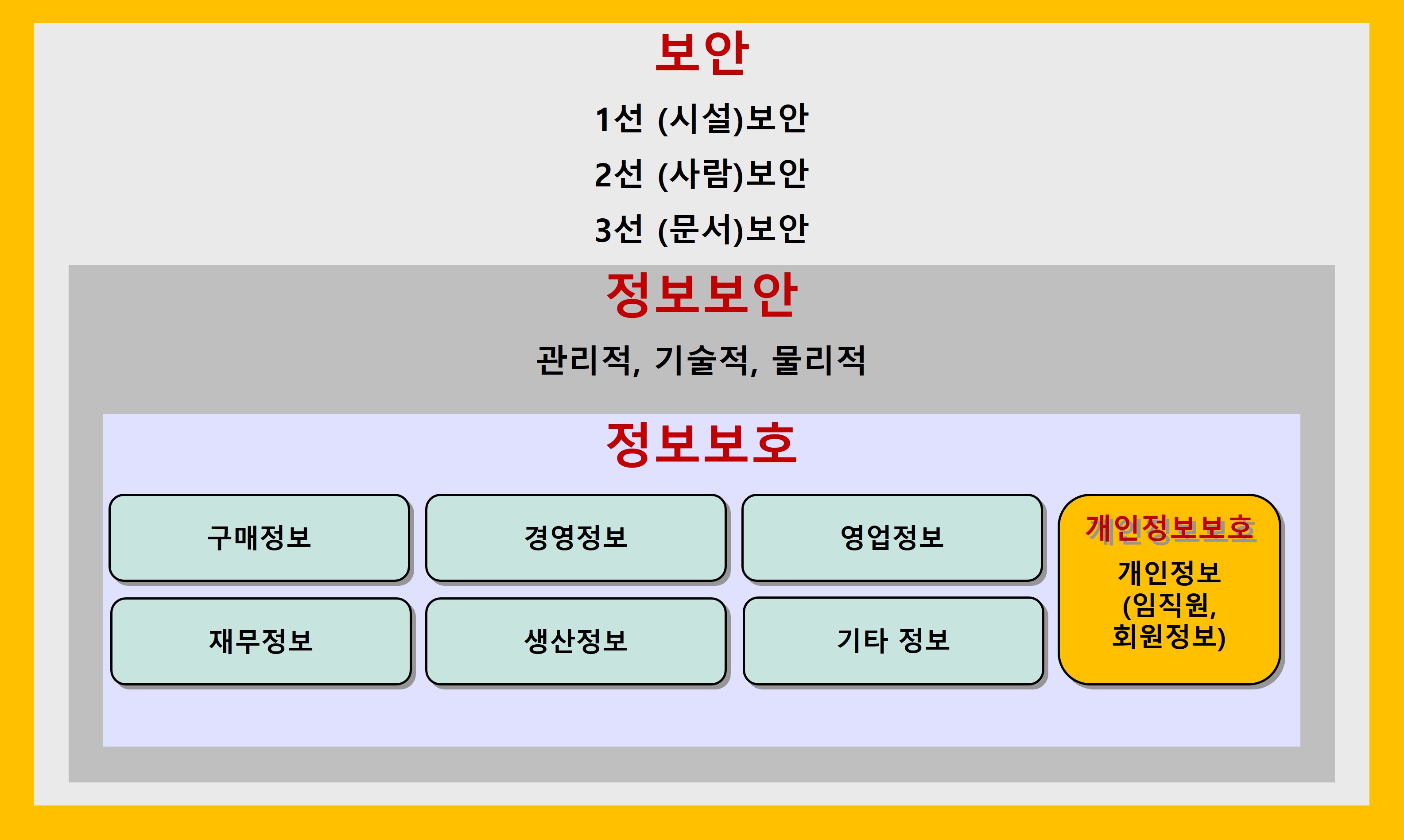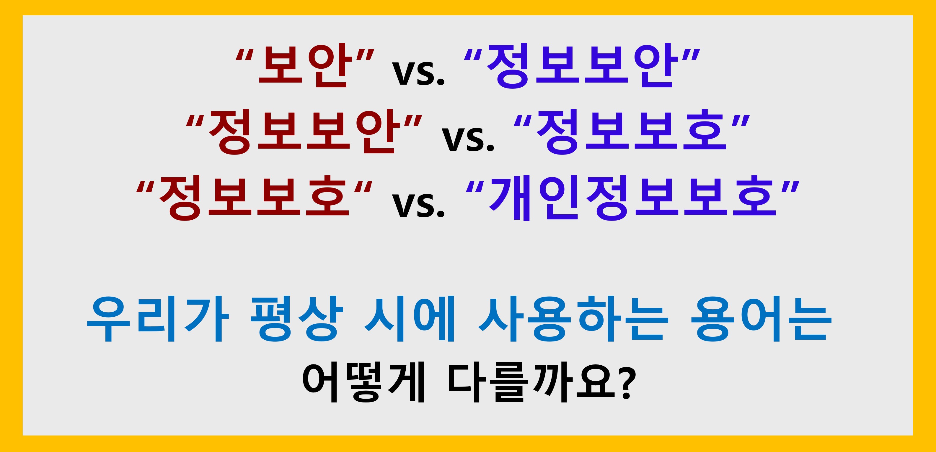 이러한 정보 중에 개인정보에 대해 정보주체의 프라이버시, 사생활 침해를 방지하기 위해 개인정보를 보호해야 하는다는 측면에서 개인정보보호(Privacy Information Protection)라는 특별한 용어를 사용하고 있습니다. 그래서 개인정보에 대해서는 개인정보보안이라는 용어를 사용하는 경우가 절대 없고 반드시 개인정보보호 용어를 사용하고 있습니다.